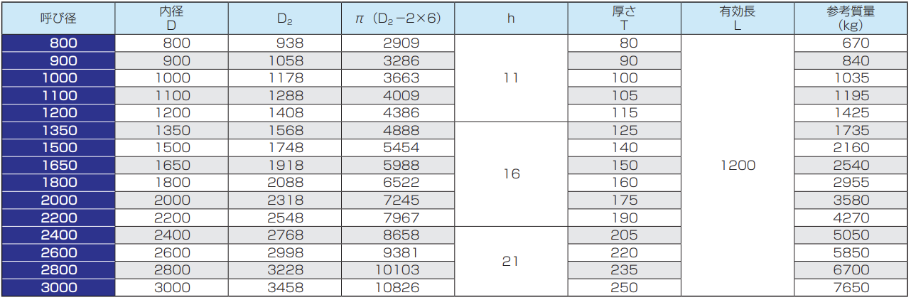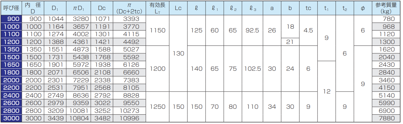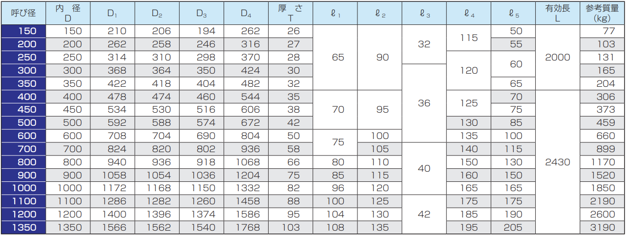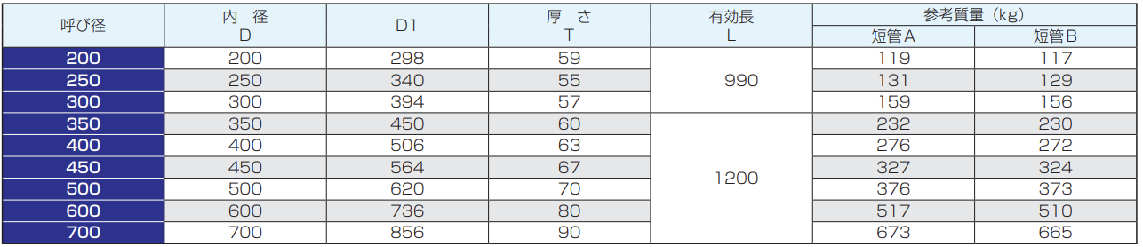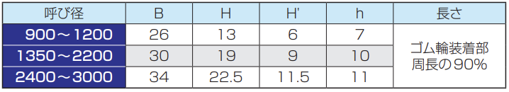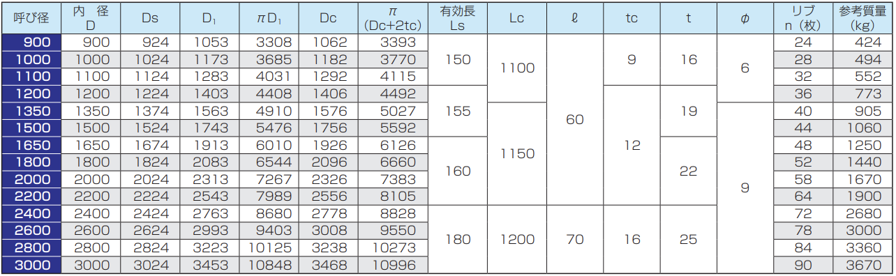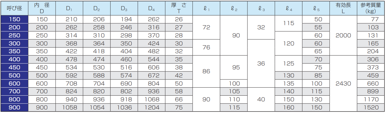 ※呼び径150及び200の管の有効長は500mmまたは1000mm、呼び径250〜350の管の有効長は1000mm、呼び径400〜900の管の有効長は1200mmとすることができます。