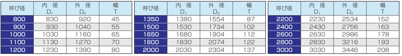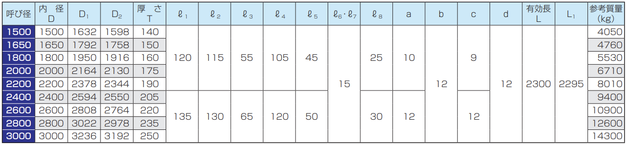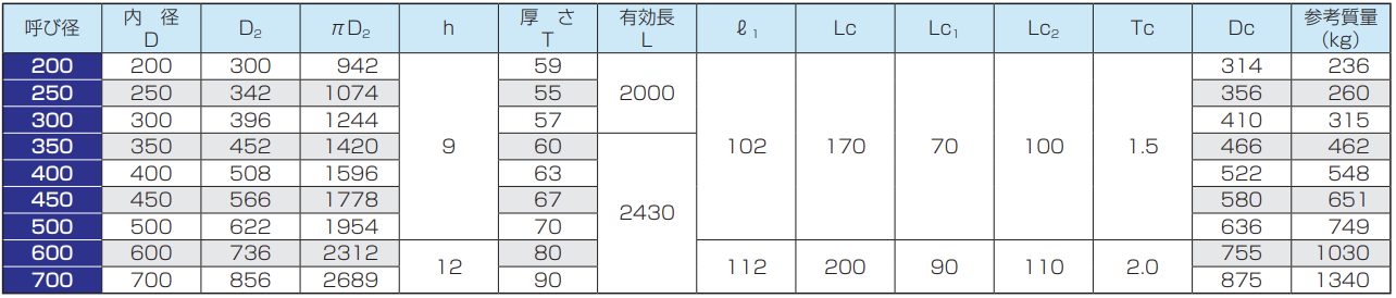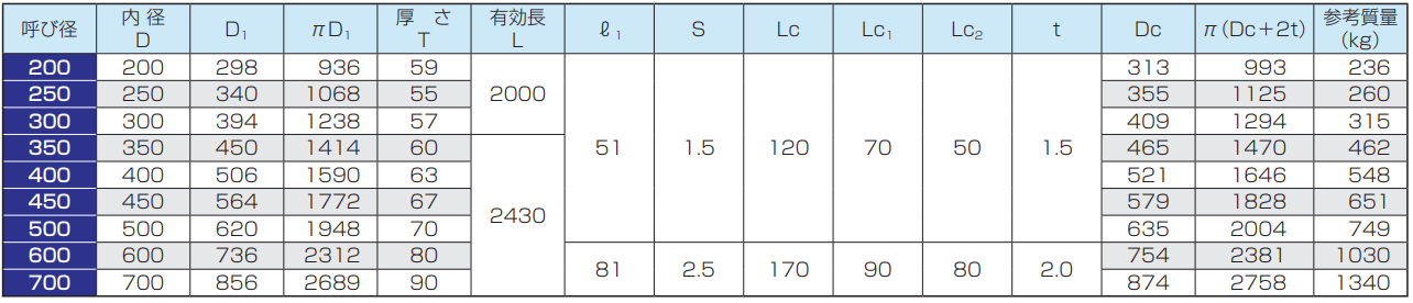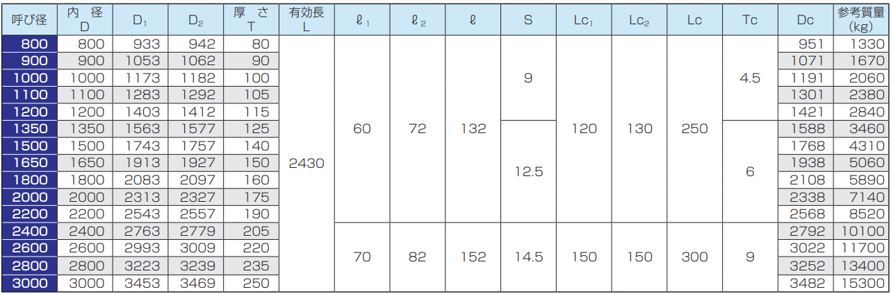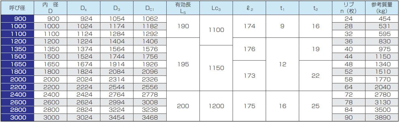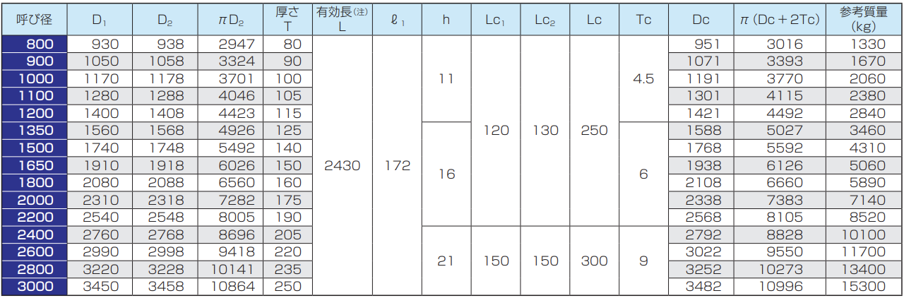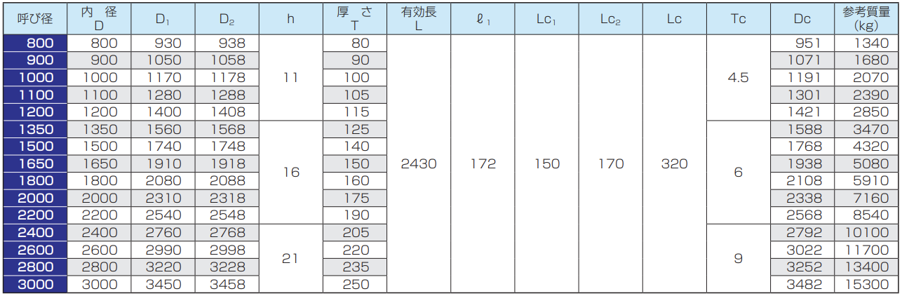 ※呼び径150及び200の管の有効長は500mmまたは1000mm、呼び径250〜350の管の有効長は1000mm、呼び径400〜900の管の有効長は1200mmとすることができます。