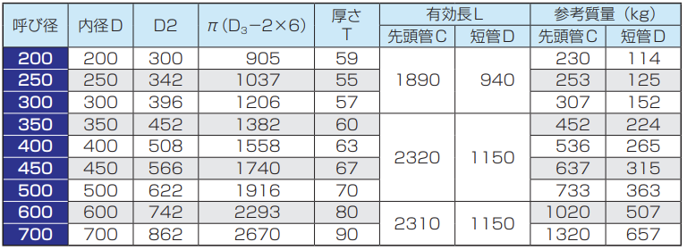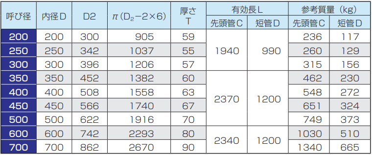 ※先頭管の有効長は、呼び径200 ~ 300については1000mm、呼び径350 ~ 700については1200mmとすることができます。