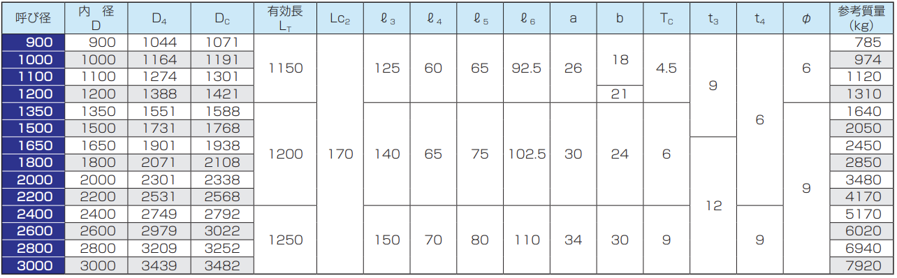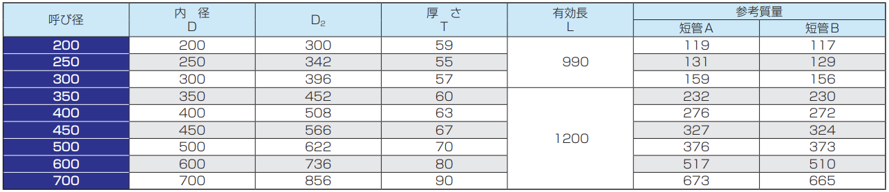 ※呼び径150及び200の管の有効長は500mmまたは1000mm、呼び径250〜350の管の有効長は1000mm、呼び径400〜900の管の有効長は1200mmとすることができます。