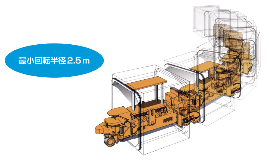 運搬機の前・後輪がそれぞれ独立して駆動するため、従来の横引き工法に比べ急曲線・折れ点部での施工性に優れています。
