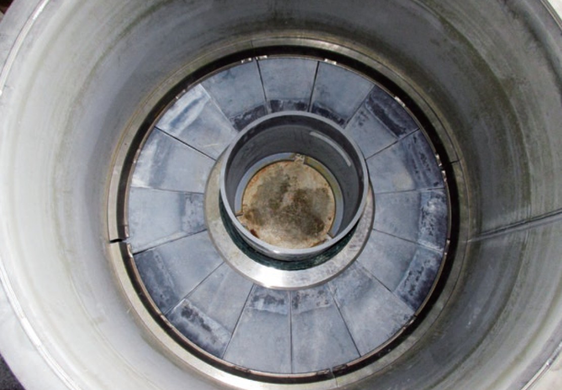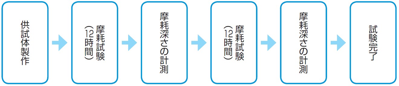 試験は円筒型の試験機の底に5検体(3枚/検体)の供試体を円環状に設定し、水および摩耗材を投入し、水流を発生させます。水流と摩耗材により選択的摩耗を促進させ、その摩耗量を計測します。