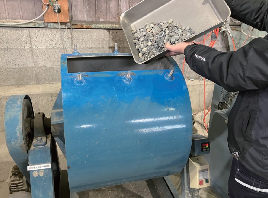 ロサンゼルス試験機内で骨材を一定量の鋼球と共に回転させ、すり減りを促進し、その減少量を確認