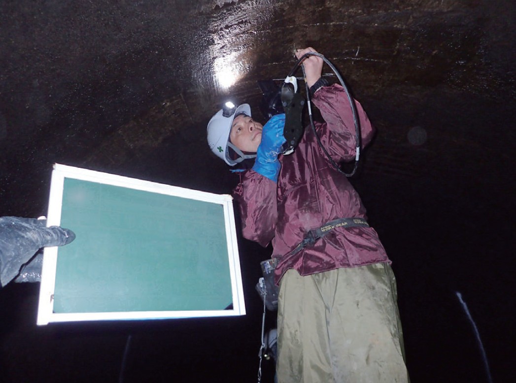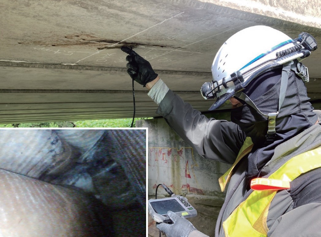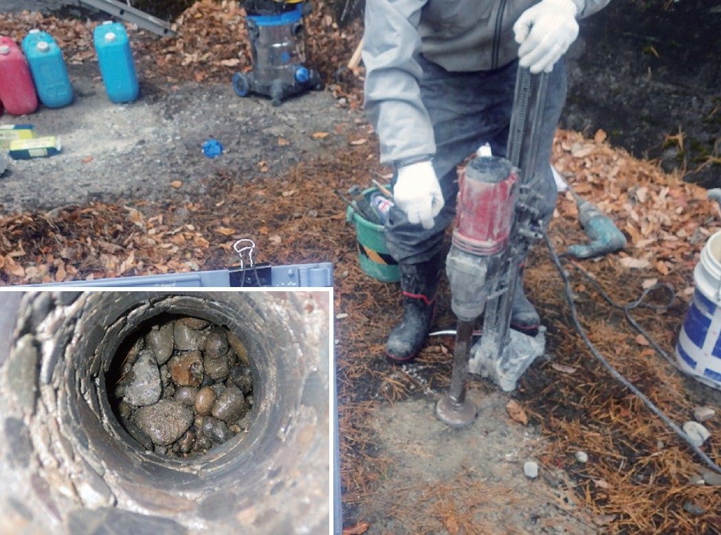 空洞等が疑われる箇所に、ドリル等で調査孔を設けファイバースコープを挿入し、内部を確認します。
