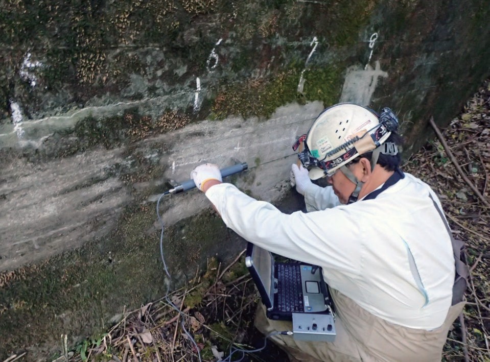 コンクリートに送受信の端子を設置し、端子間を伝搬する時間から超音波伝搬速度を算出します。スクリーニングや定期点検で活用できます。