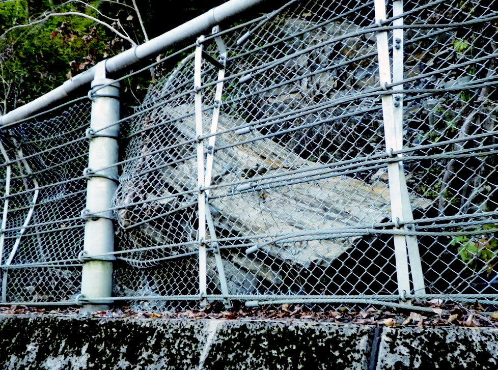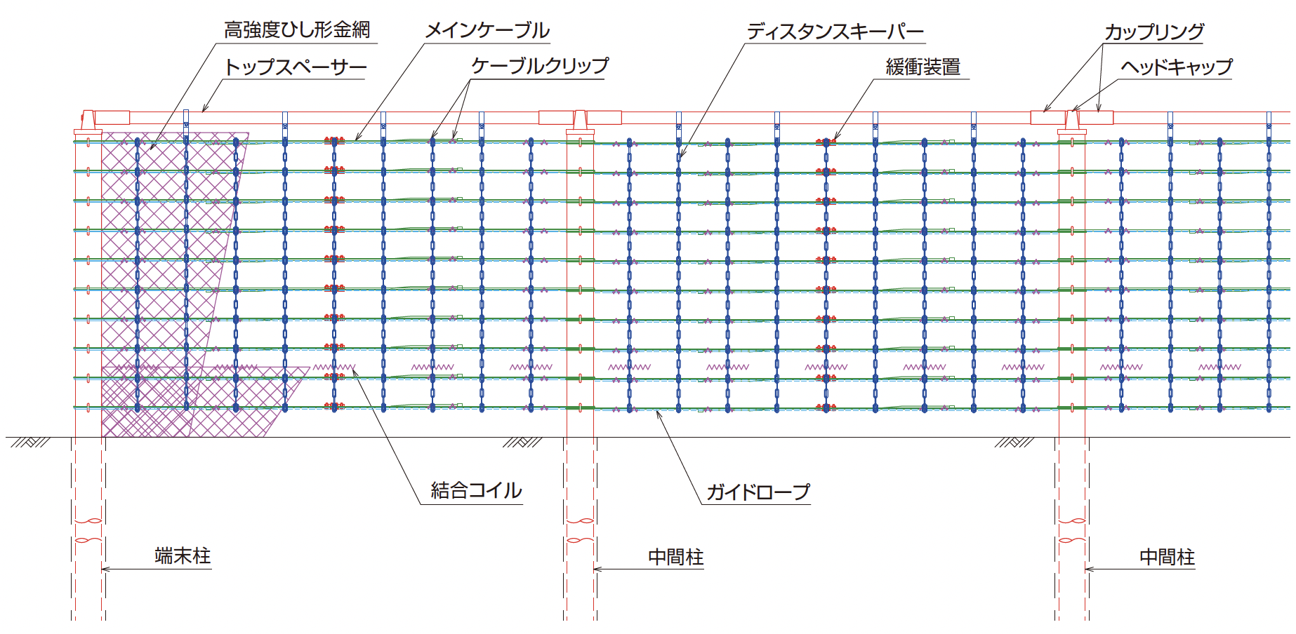 落石時には、ループ状に巻きつけられた山側と谷側のロープが同時に働き、結果的にワイヤロープ間隔を狭める効果があります。