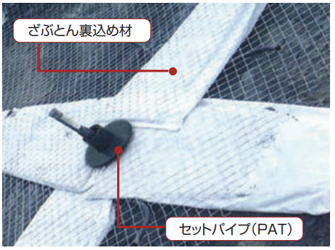 背面の不陸が大きい場合などには受圧板と背面の一体性が不均一になり適正なアンカー力を伝える事が出来ないだけでなく、施工時のトラブル或いは設置後のテンションの減少の原因ともなります。ざぶとん材、セットパイプ使用で問題を解決。受圧板と背面の間にざぶとん材(セットパイプの使用を推挙)を配置します。(緑化する場合には、ざぶとん材の上にラス網等を配置して下さい。)