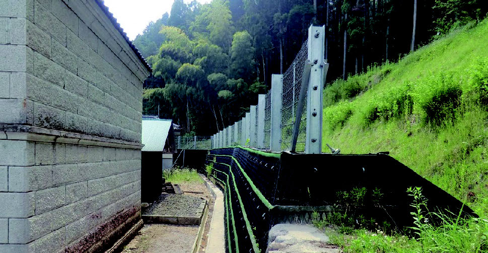 堤体は地山にもたれた形状であり、民家裏の急傾斜地など、設置スペースが限られた現場や急峻な地形にも対応可能です。