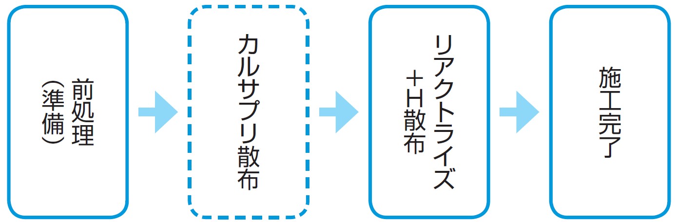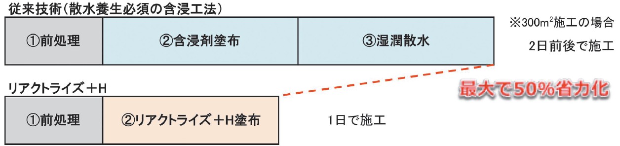 従来技術(散水養生必須の含浸工法)と比較し、散水養生・湿潤養生が不要となることで、施工日数が最大で50%省力化することができます。