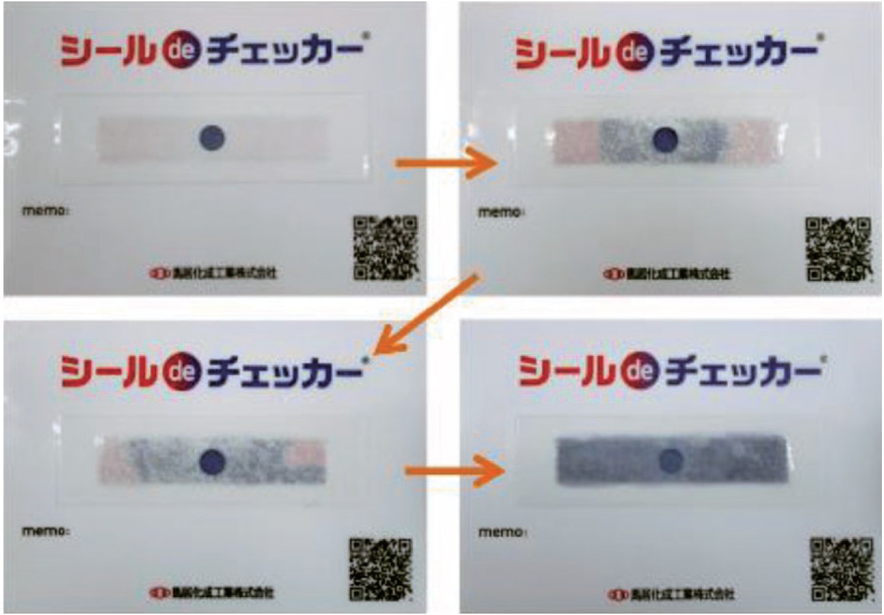オプション品 施工確認ツール「シールdeチェッカー」は、表面含浸材が上層の吸水性シート材を透過することで、下にあるリトマス試験紙が変色する構となっており、含浸材が規定量以上に塗布されれば前面変色する仕組みとしたことで、塗布重量の計測が不要となります。