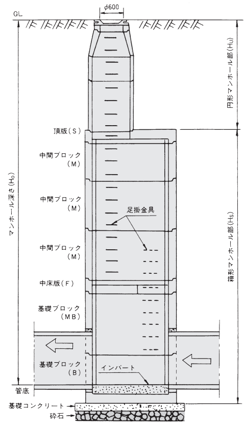 深いマンホールの場合は、一般に流入・流出が大きくなります。当製品では流入・流出管による断面縮小があっても残存壁面が多く、また基礎ブロック(B)については底版も、一体成形しているため安全です。地下水位も考慮しております。