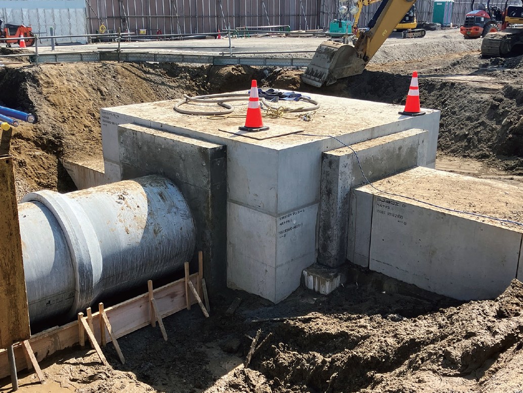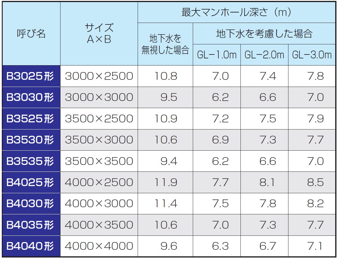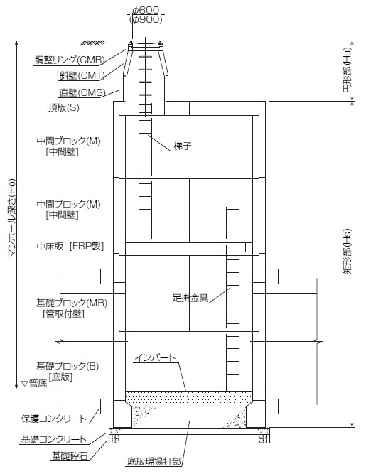 深いマンホールの場合は、一般に流入・流出が大きくなります。当製品では、流入・流出管による断面縮小があっても残存壁面が多く、また基礎ブロック(B)については底版も、一体成型しているため安全です。地下水位も考慮しております。