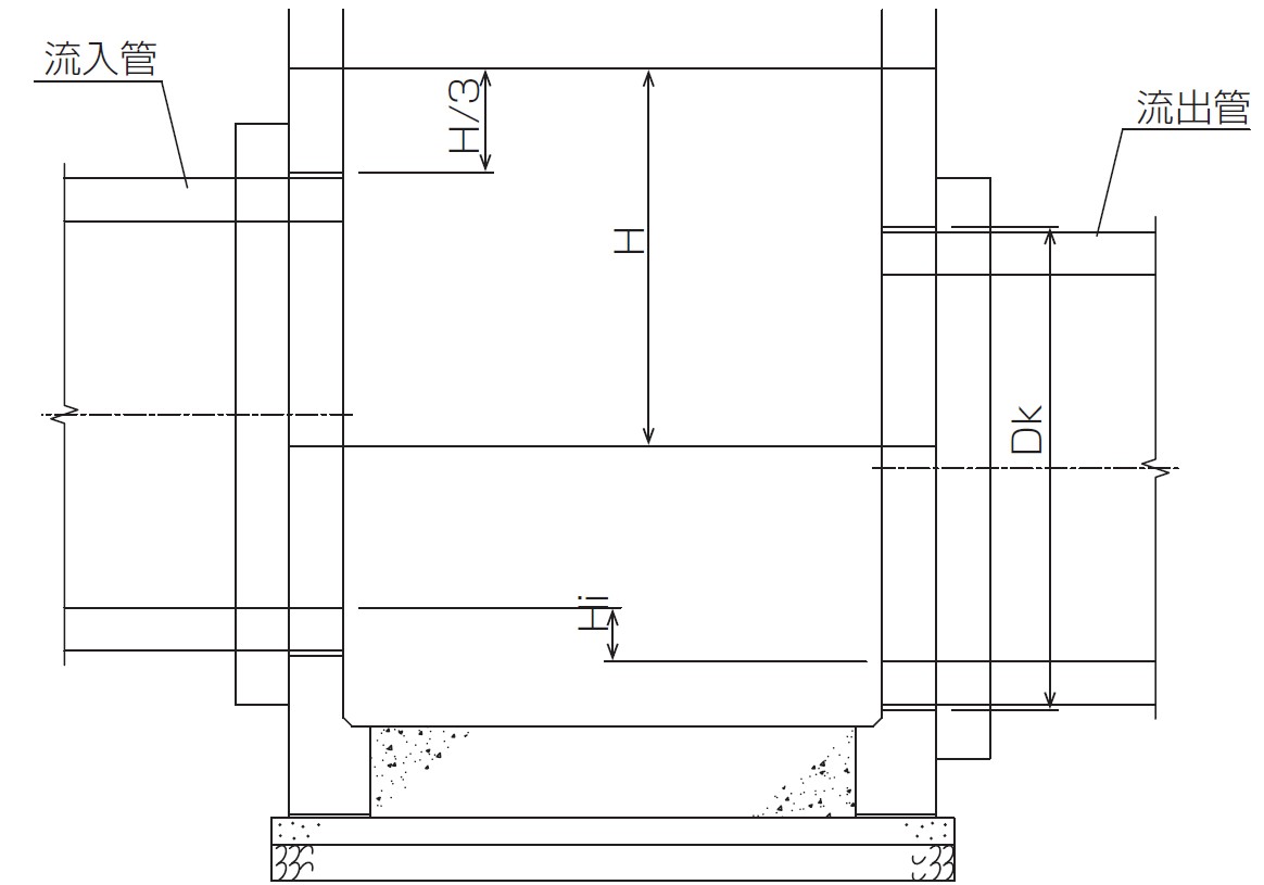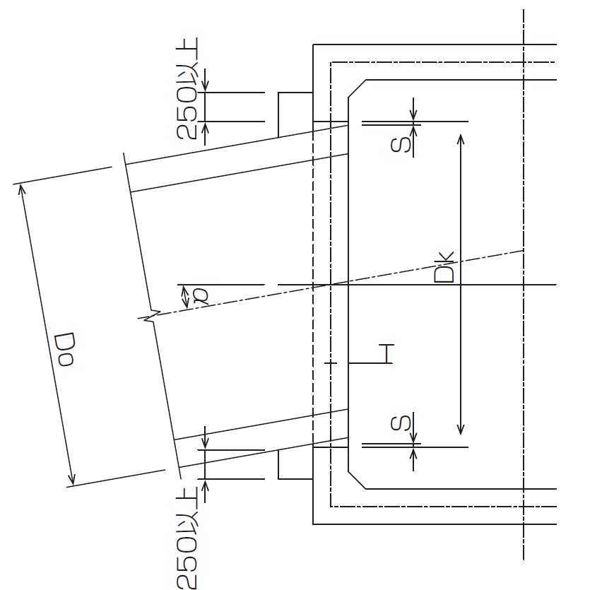 管を斜めに流出入させる場合の管中心線の位置は、下図に示すように管中心線がエスホール側壁の中心点を通る位置とします。これはボックスカルバートが流出する場合も同様とします。