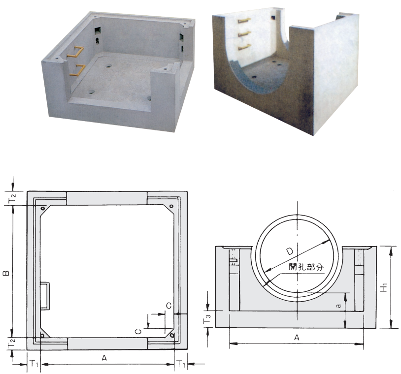 深いマンホールの場合は、一般に流入・流出が大きくなります。当製品では流入・流出管による断面縮小があっても残存壁面が多く、また基礎ブロック(B)については底版も、一体成形しているため安全です。地下水位も考慮しております。