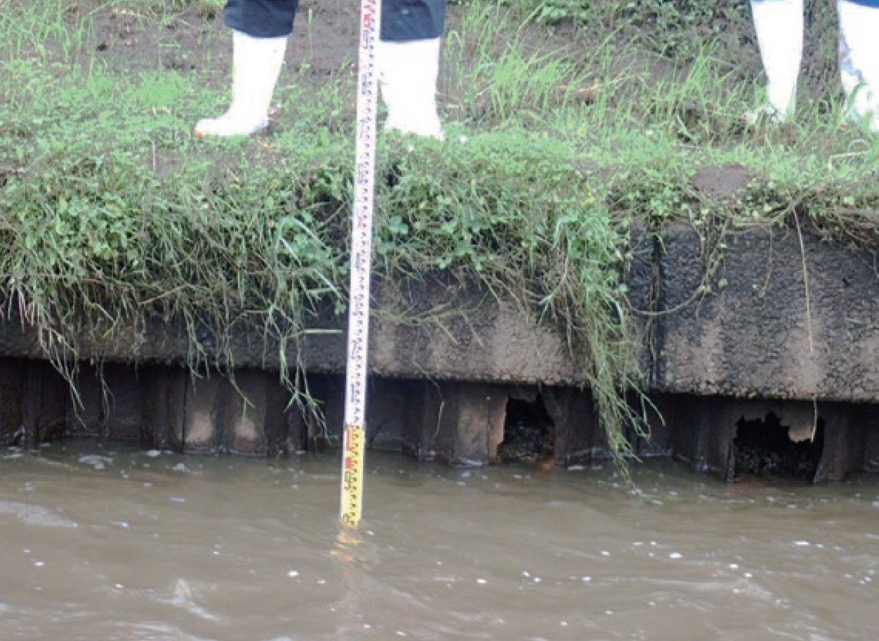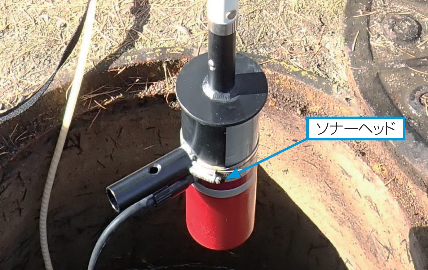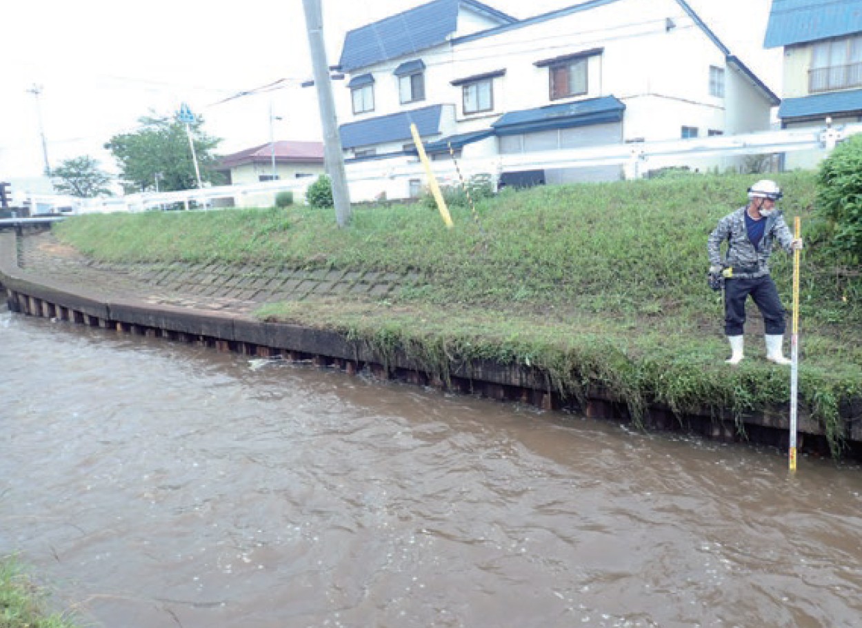 ●濁水、水位により視認できない排水路にて、水中ソナーにより