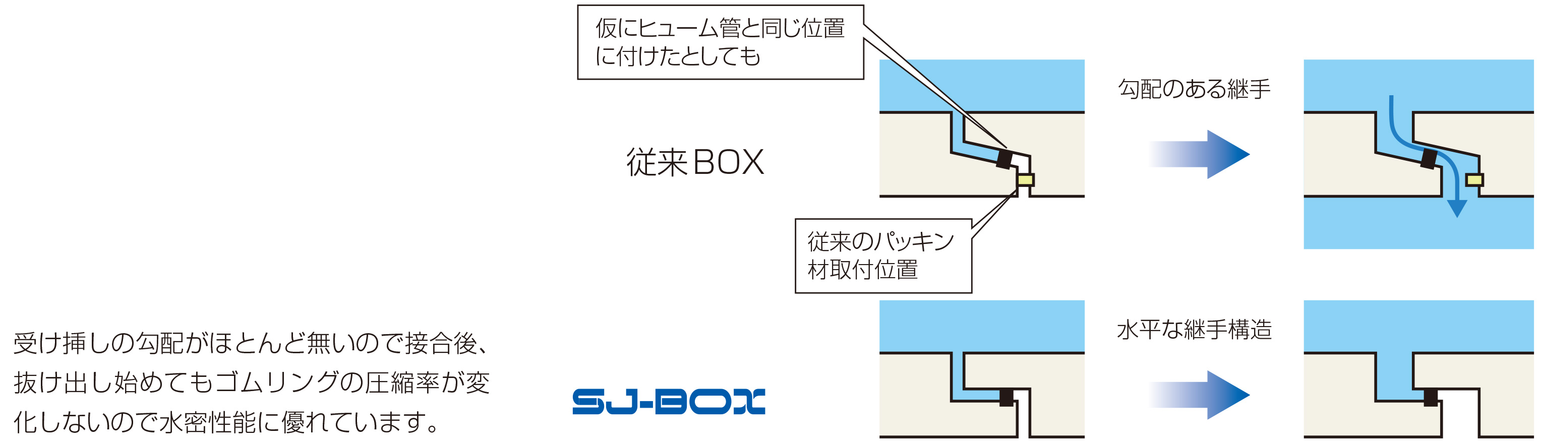 勾配のない受け挿し形状とゴムリングにより、自動的にBOXのセンターが整合します。