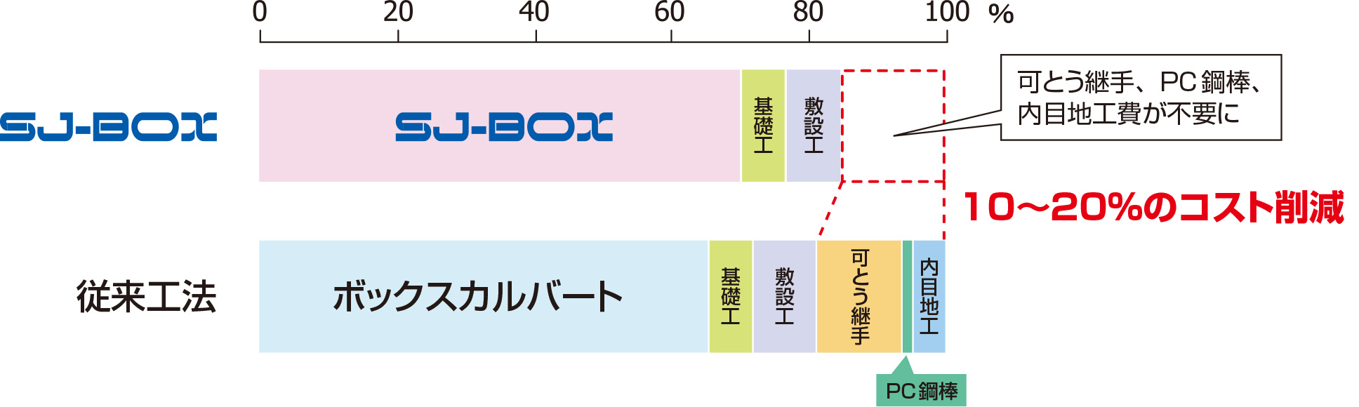 従来工法(二次製品)と比較して、コストダウンが可能です(直工費比較)