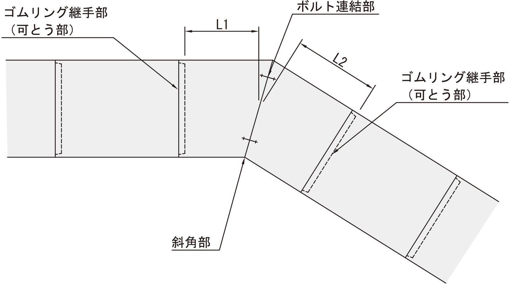 そのため、耐震計算では製品L寸法を長く、SJ-BOXのゴムリング継手間隔、右図でL1+L2の長さで計算を行います。