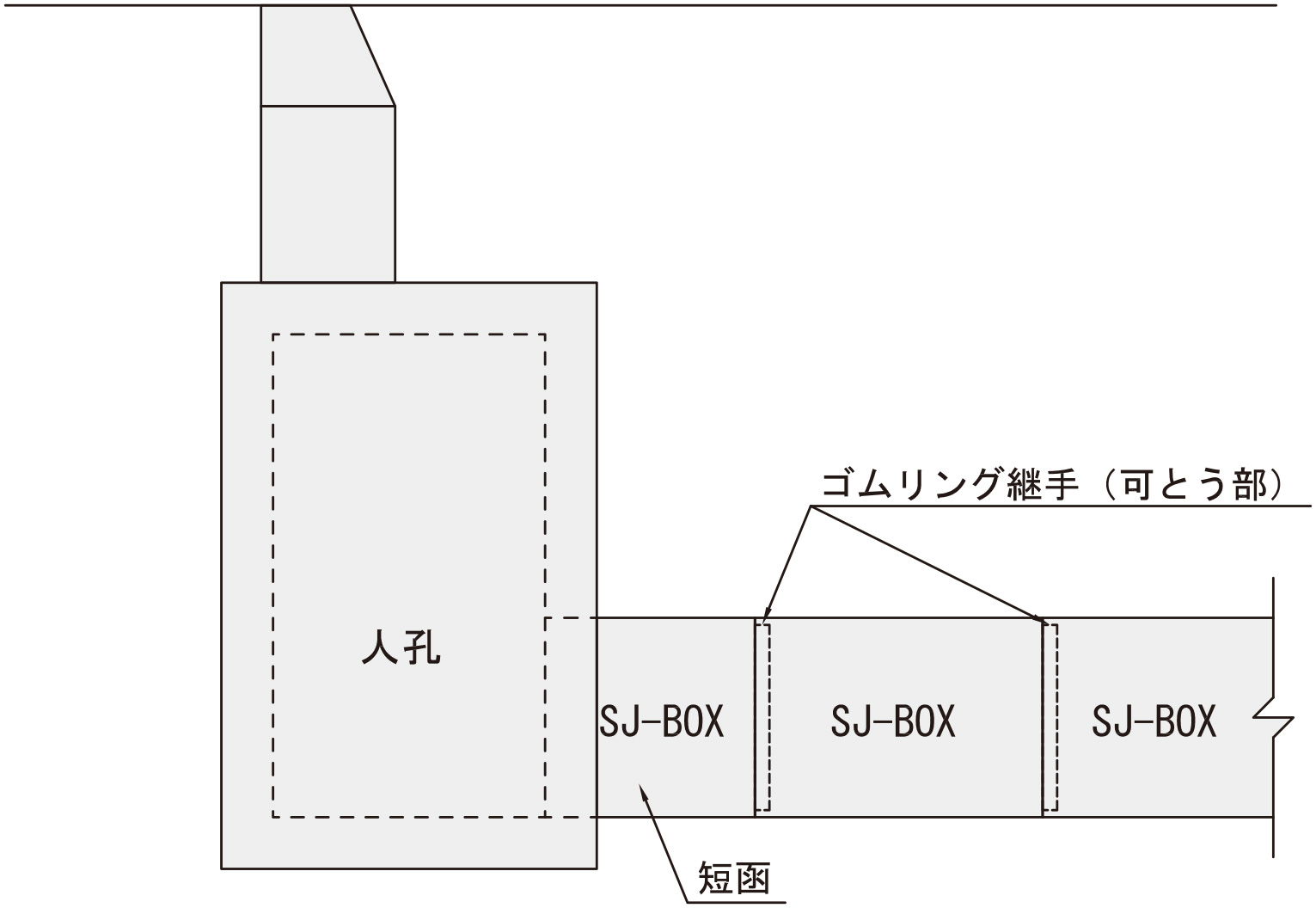 人孔際は、ヒューム管と同様に短函(製品長の短いSJ-BOX)を人孔際に配置することにより、SJ-BOXゴムリング継手部の可とう性を活かして、耐震検討を行なうことを標準としています。