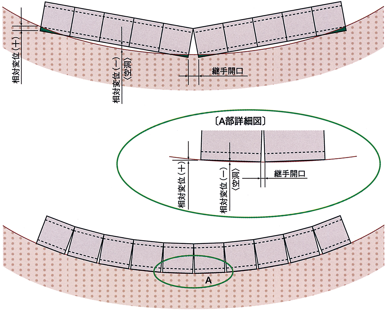 個々の継手に可とう性があるので、地盤と函体間の変位差(相対変位)が小さくなり、堤防内に空洞の発生が少なくなります。また、躯体縦方向の発生断面力も小さくなります。