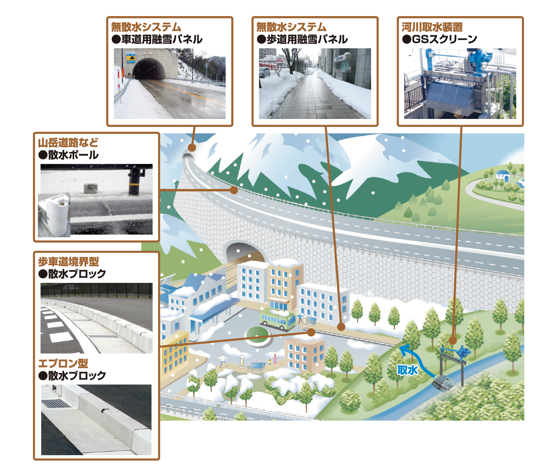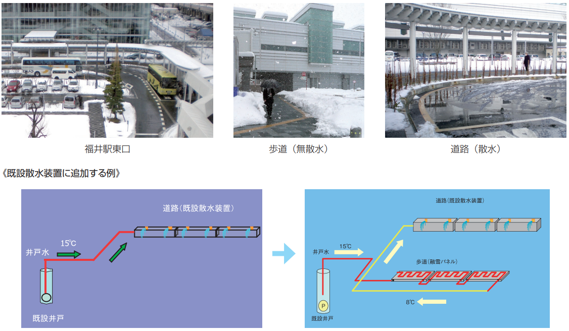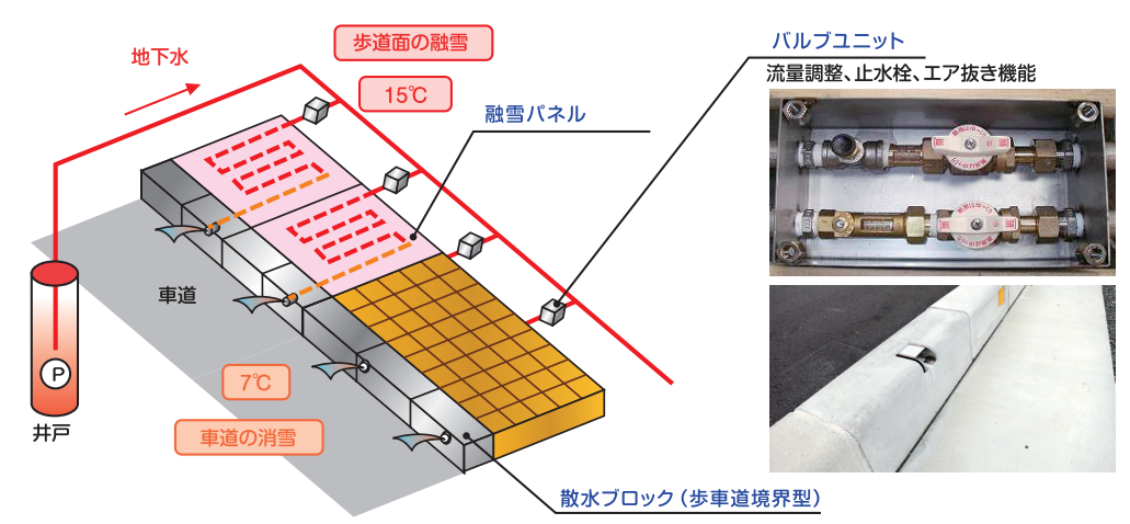 従来消雪水に利用されている地下水を、歩道に埋設した融雪パネルに流し、歩道上の雪を融かした後、 その水で車道を散水する工法です。 夏期には循環と散水により路面を冷やすことで、ヒートアイランド現象の軽減効果もあります。