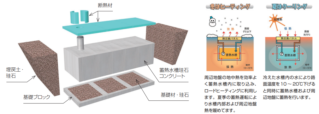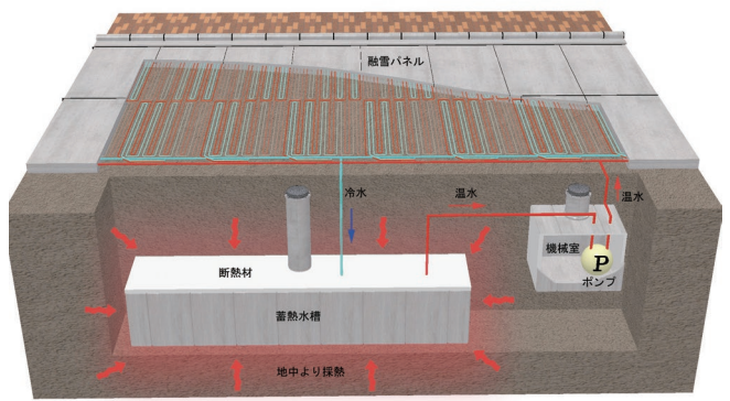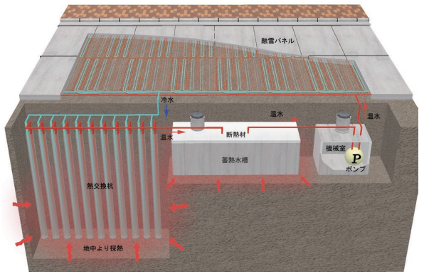 深度約25m程度までの比較的浅い地中に埋め込んだ集熱水槽によって地中熱を採熱し、その温水を舗装体に埋設した放熱管に循環し、融雪及び凍結防止を行なうシステムです。夏場に稼働させることで、温められた