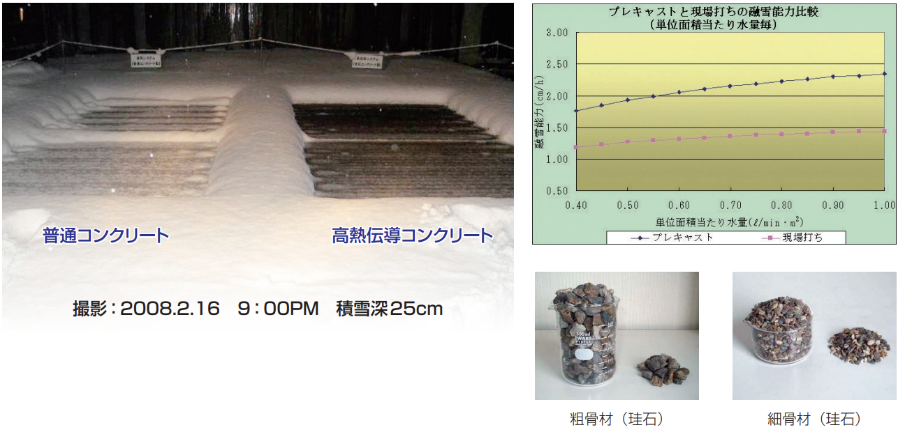 使用するコンクリートの骨材には珪石 を使用しており、通常の骨材を使用し た普通コンクリートの約2倍の熱伝導が あります。冬季には効率の良い路面融 雪用として、また夏季には路面冷却用 としてご利用頂けます。