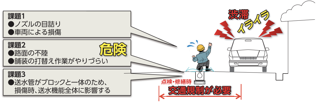 ● 従来工法(埋設型散水ブロック)の課題