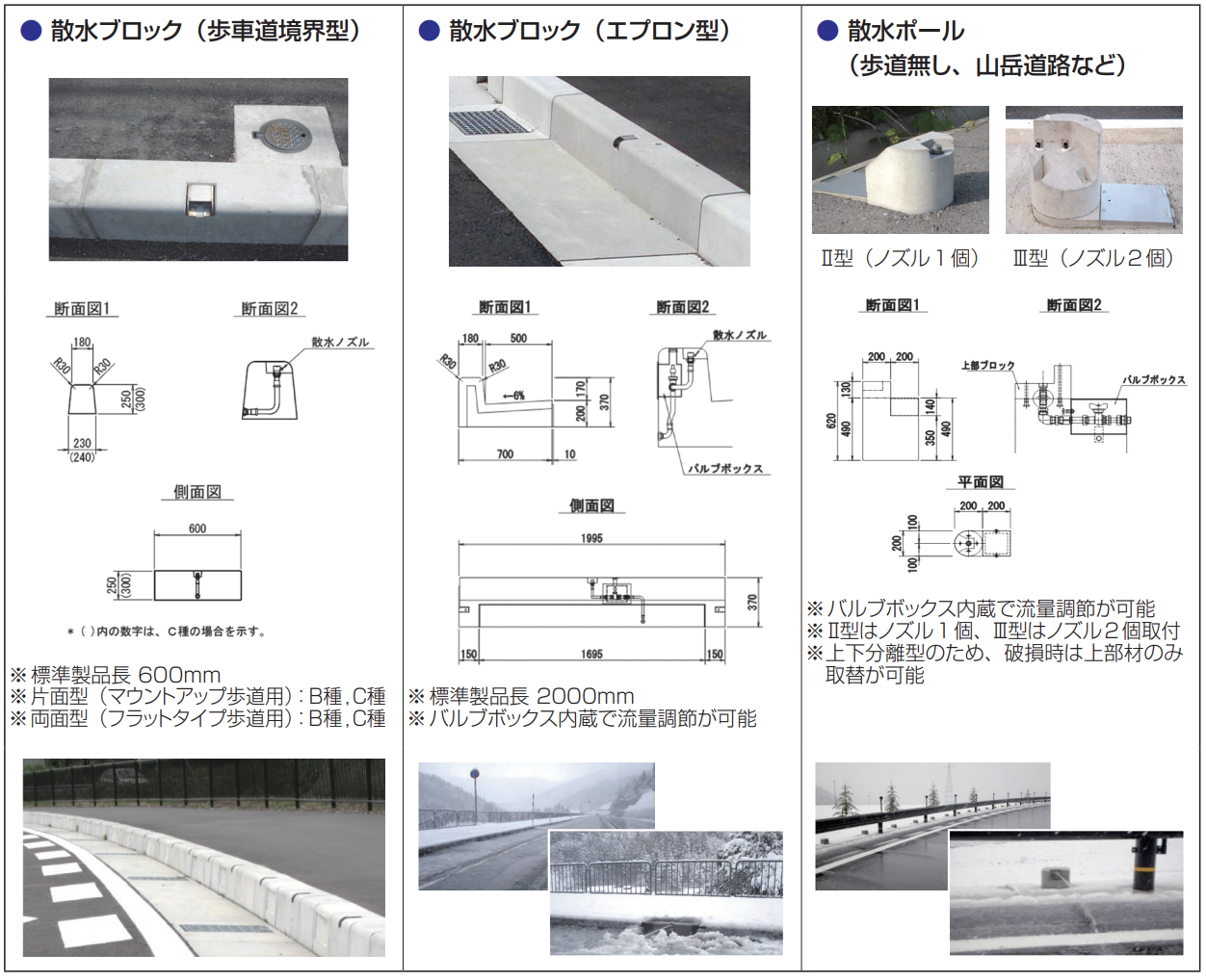 ❷ 用途により複数のタイプをご用意(歩車道境界ブロック型、街渠一体型、単独型など)