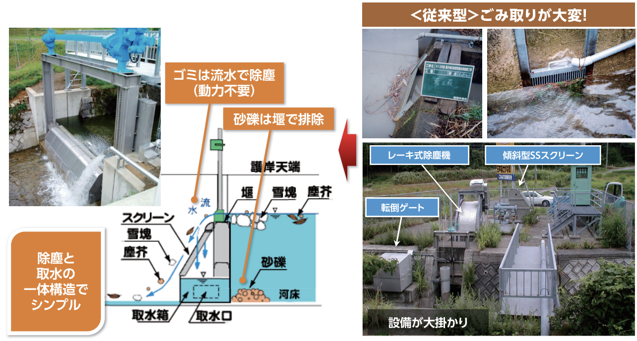 GS水路は、プレキャスト水路にGSスクリーンを一体化した取水システムです。
