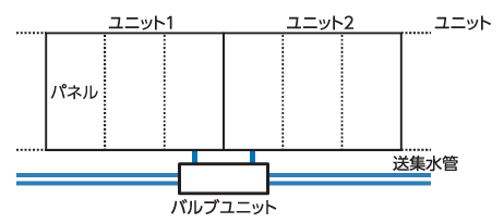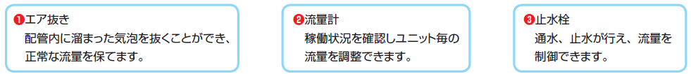 バルブユニットは、送水調整に必要な3機能(流量計・止水栓・エア抜き)を内蔵しており、送集水管と パネルの間に接続するだけの簡単施工で安心してお使いいただけます。