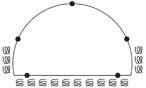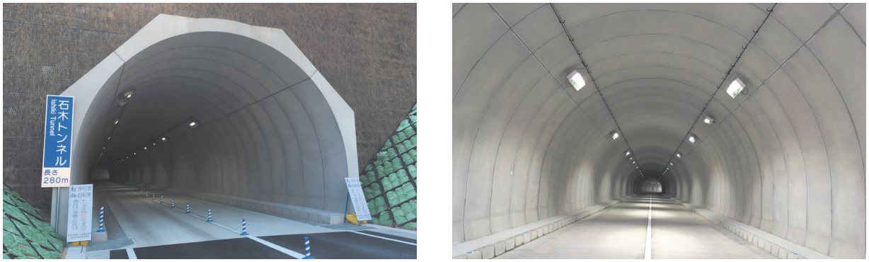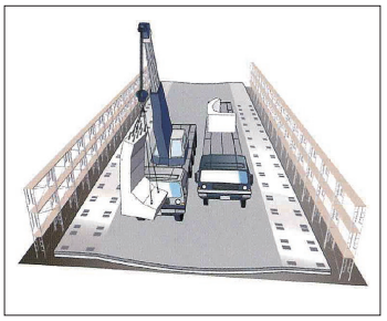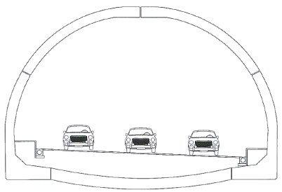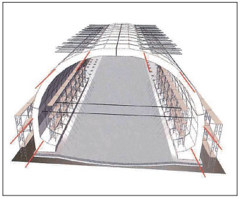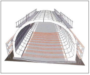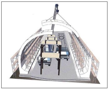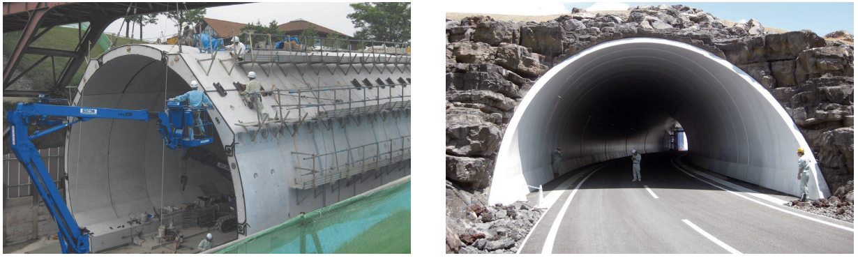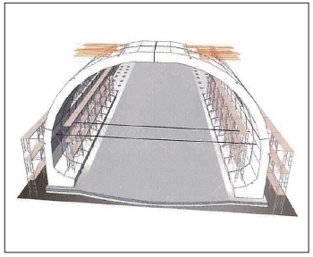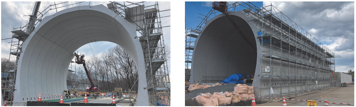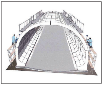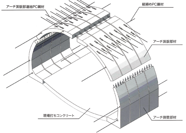 アーチ頂版部材の外側にパイプサポート、内側にトライワイヤーを設置。移動式支保工を組立てた後、アーチ頂版部材を現場に搬入し、所定の位置に架設する。
