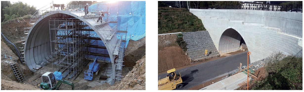 地山開削後均しコンクリートを打設。両側にアーチ側壁部材を据付。(標準ブロック10ピース)