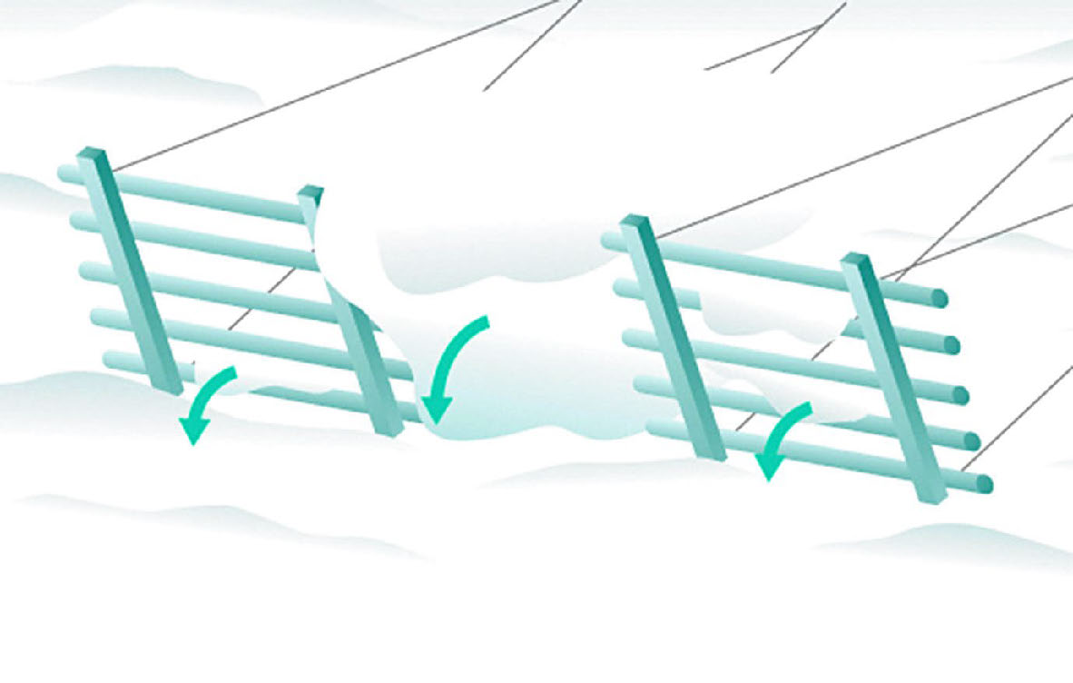 支柱間に金網とワイヤネットを張設した連続構造のため、従来の雪崩予防柵に見られたバーの 隙間からの雪のすり抜けや、柵と柵の間からの雪の抜け落ちがありません。