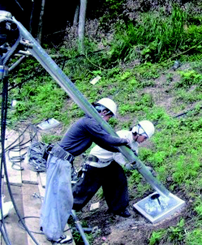 アンカーで地山を係留する構造のため、大掛かりな基礎が不要で、小型の削岩機やボーリングマシンでの削孔が可能です。また、人力 運搬・人力施工が可能なため、短工期・低コストでの施工を行うことができます。