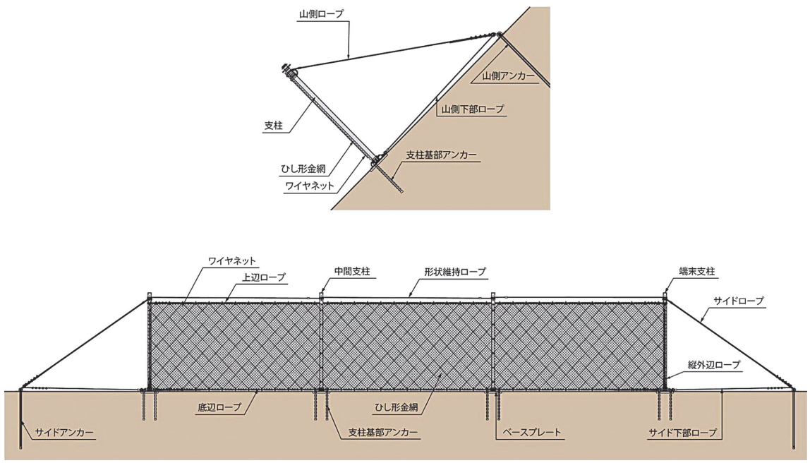 基礎部がアンカー構造のため、地山の掘削がほとんどありません。また、対策範囲の地形にあわせて支柱間隔を変えることができるため、立ち木を避けながらの配置が可能です。
