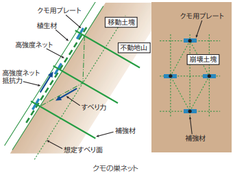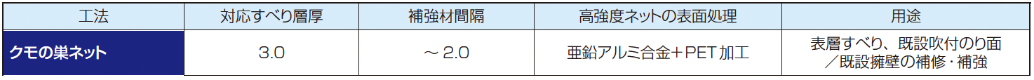 高強度ネットと補強材を組合せることで、従来の鉄筋挿入工 に補強材間の中抜け(すり抜け)のすべり力に対して抵抗することを付与することができます。想定すべり層厚3.0m以下 の表層すべり対策や、既設吹付のり面、擁壁の補修・補強対策として使用することができます。