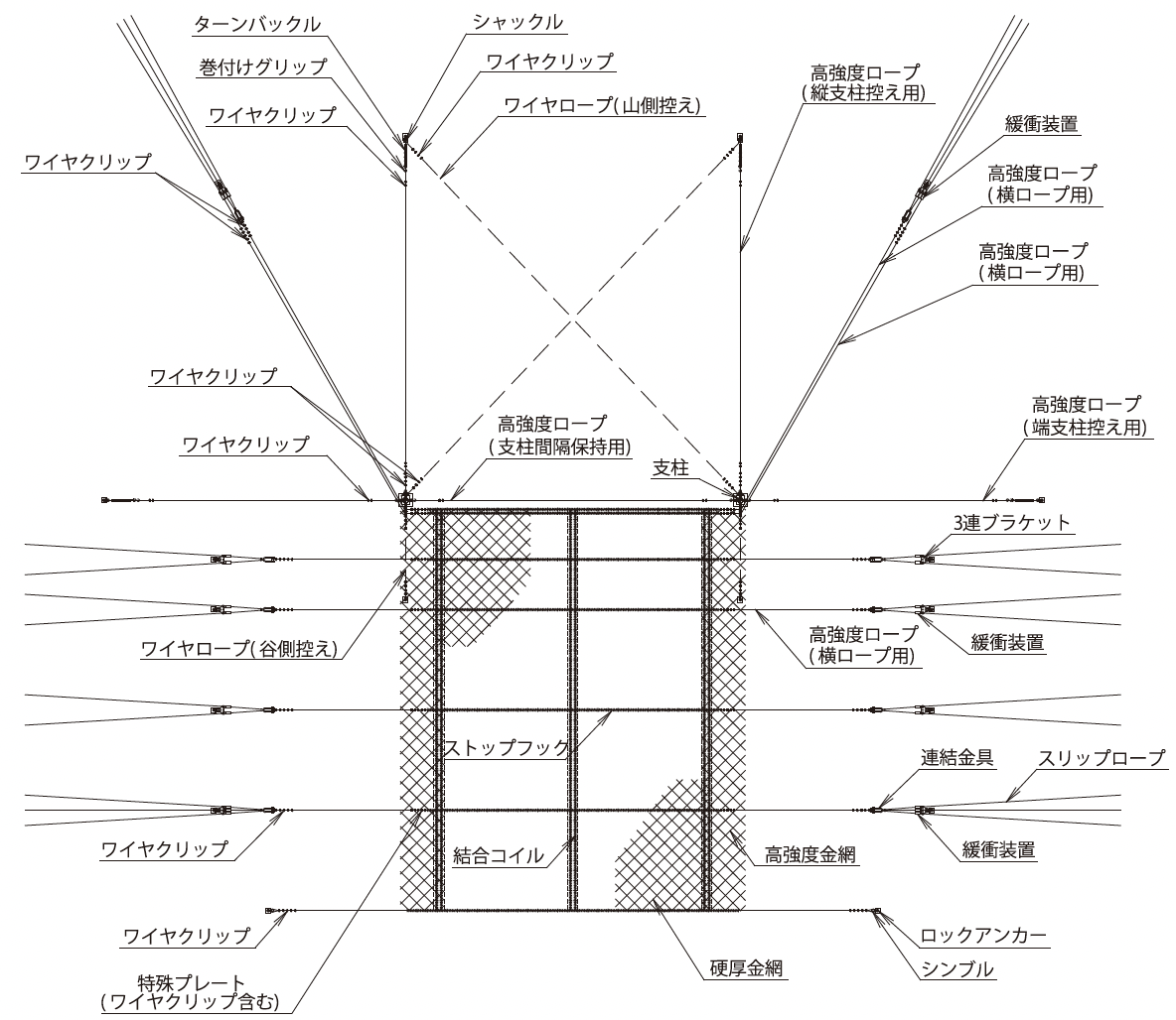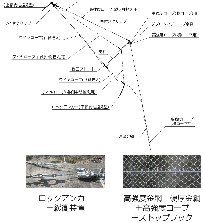 高強度金網・硬厚金網を使用し、必要なロープ本数を減らすことで、全体的な軽量化を可能とし、さらに、落石エネルギーごとに最適なタイプを選ぶことで、施工性・経済性に優れた構造とすることができます。