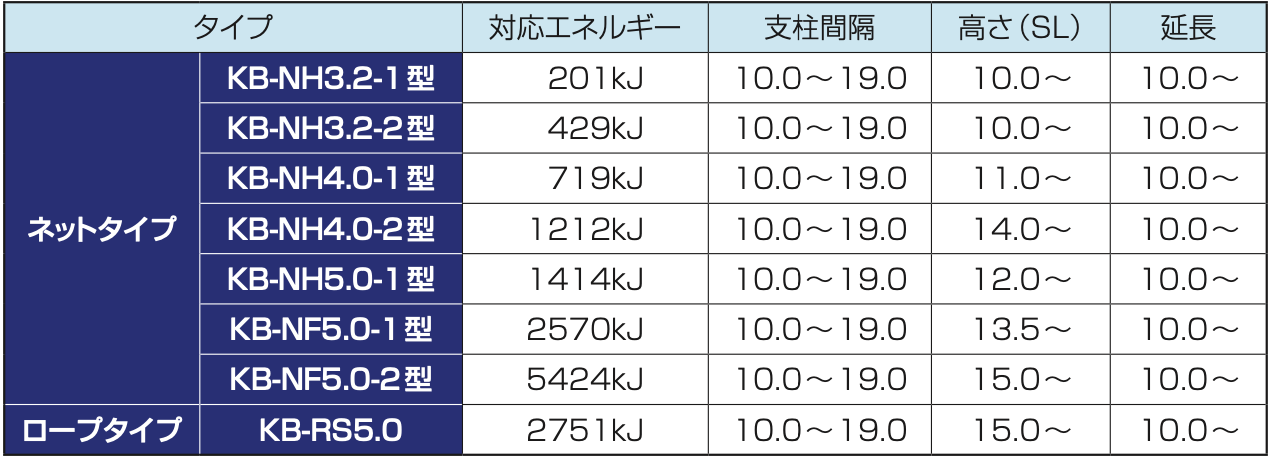 ロープタイプは2700kJクラスの、ネットタイプは200kJ~5000kJの最適なタイプを選ぶことができます。