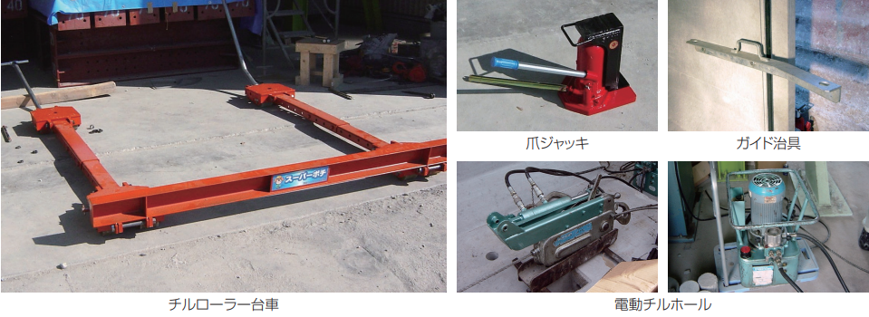 使用する機械は、簡易な搬送用台車「ポチ」と爪ジャッキおよびバックホウや電動チルホールだけで、特殊な機械は不要なため、現場条件の変化に対応できます。