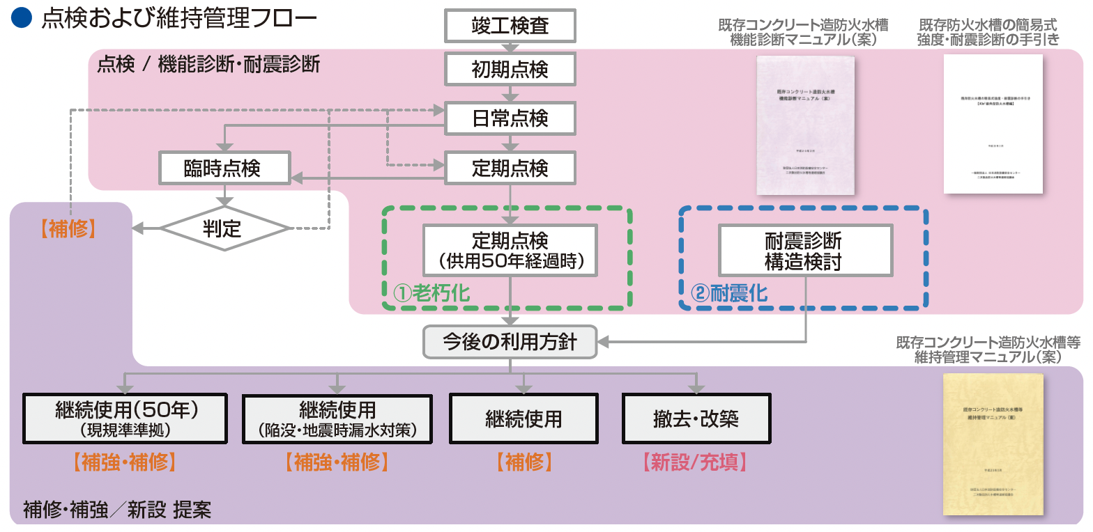 診断・補修・補強は、『既存コンクリート造防火水槽等維持管理マニュアル(案)』(一財)日本消防設備安全センター(H23.3)をはじめ、関連指針に準拠して行います。防火水槽の調査・診断から補修・補強設計・施工まで、目標性能を満足する最適なご提案、ならびに施工を行います。
