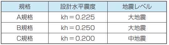 標準設計水平震度 k0=0.25 発生確率は低いが直下またはプレート境界で発生する地震を想定した高レベルの地震動です。一般に震度6 ~ 7程度を想定しています。