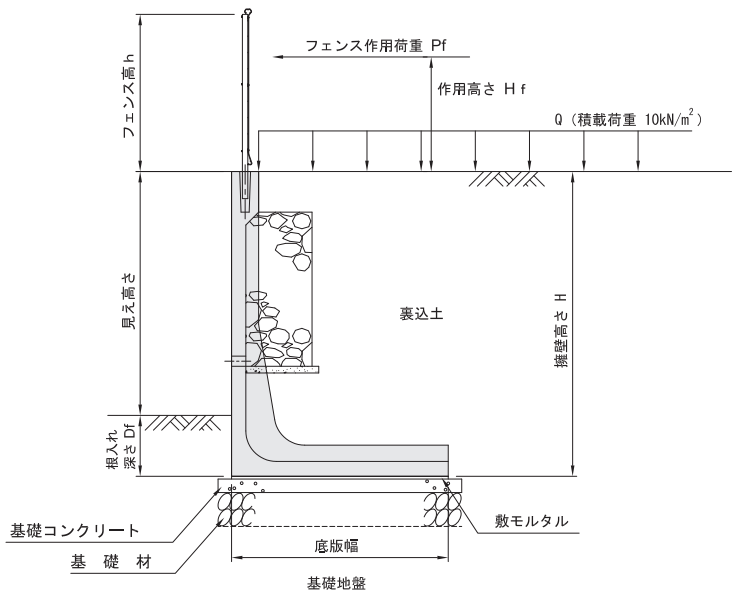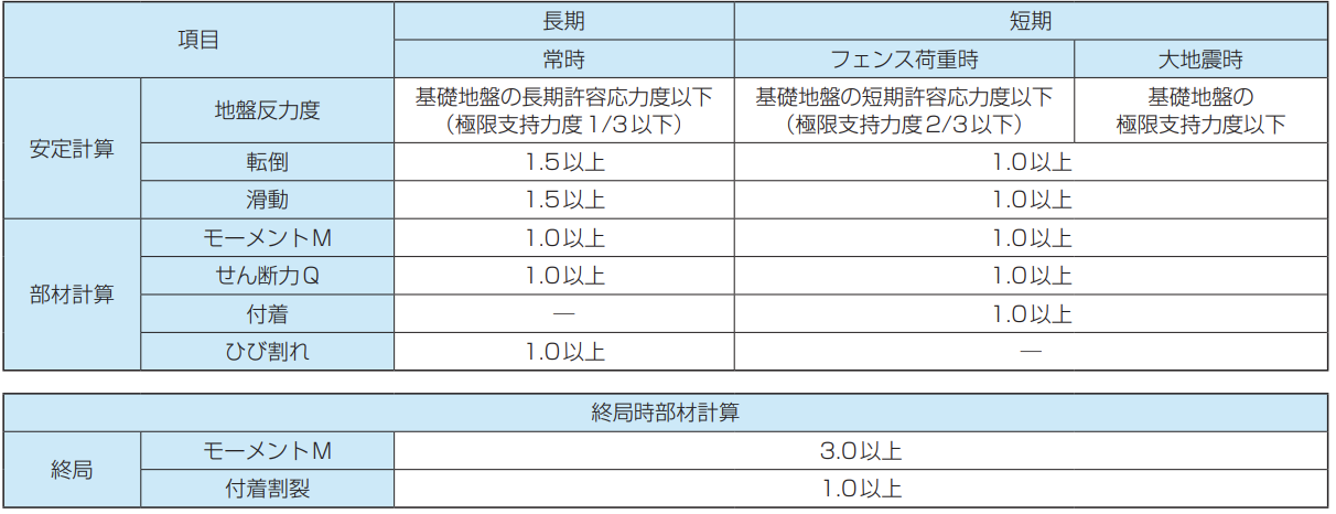 ・フェンスの支柱間隔が2m以下、フェンスにかかる風圧力が1kN/m以下、フェンス自重が50kg/m以下としてください。