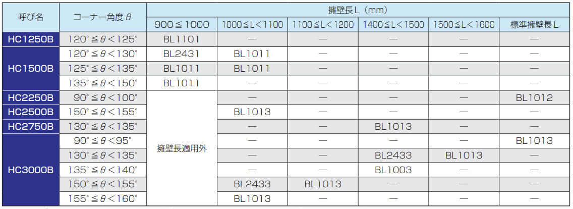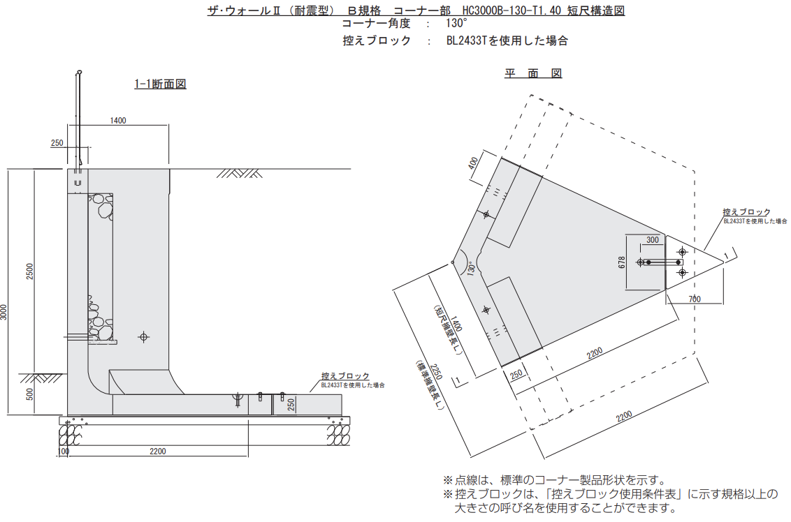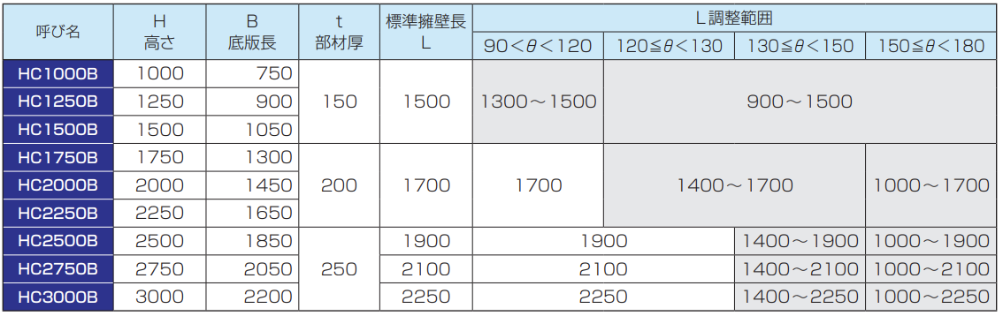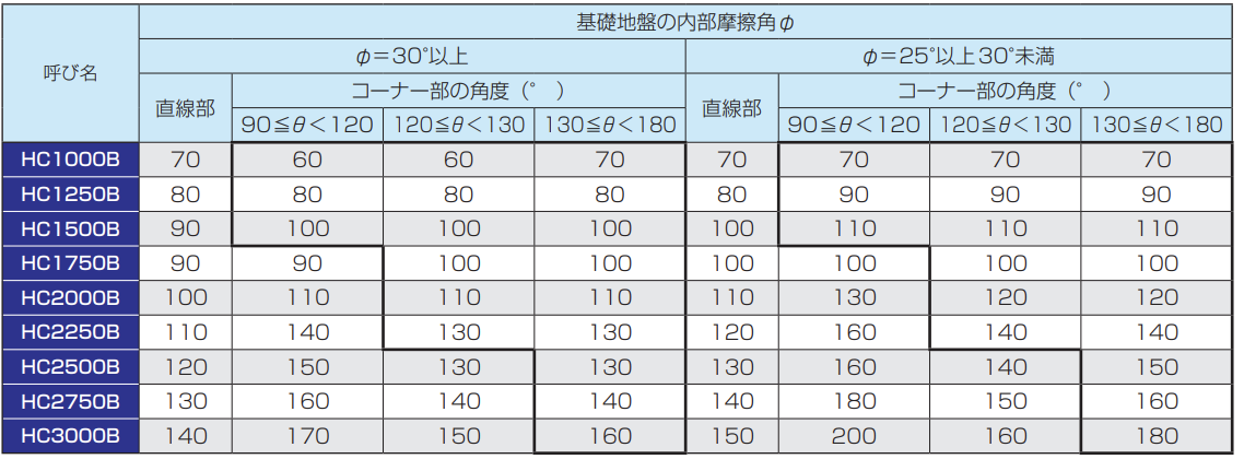 ※2 上表は規格上の標準の設定であり、コーナー角度(θ)と擁壁長(L)を使用する製品の設計値に基づき、再計算行うことにより、控えブロックが不要な場合があります。