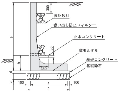 ・前壁の背面には砂利等を全面に施した透水層を設置してください。また、浸透水を有効に排水するために、透水層の最下端部分に、止水コンクリートを設置してください。