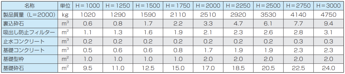 ※上表の網掛け部が、擁壁長Lの調整範囲です。