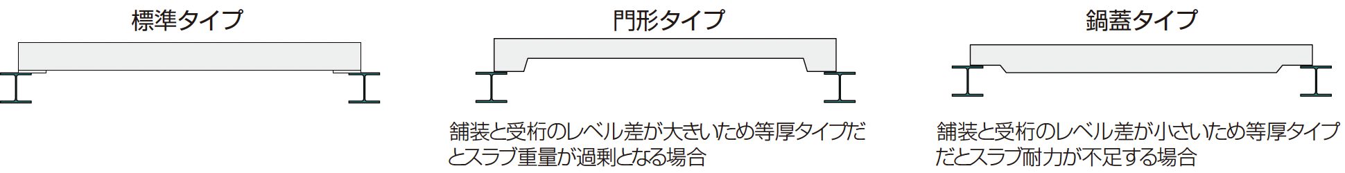 既存のホーム受桁の高さ調整、加工をすることなく床版を入れ替えることが可能です。 標準的な等厚タイプの他に門型タイプ、 鍋蓋タイプなど現場のニーズに合わせ断面形状を設定できます。