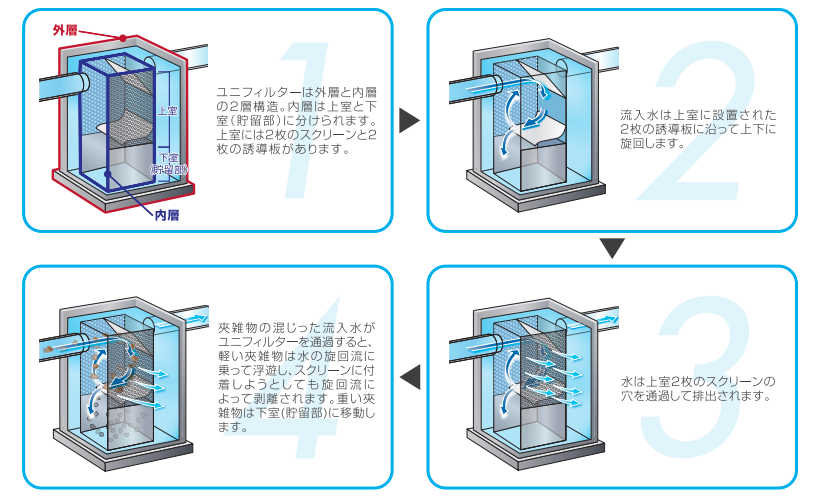 旋回流を発生させゴミによるスクリーンへの付着を軽減します。